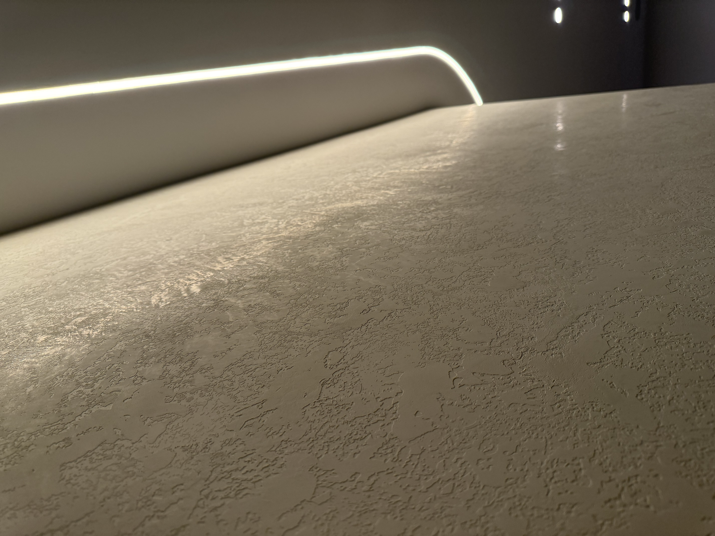 Novka Place in Narre Warren North showcases custom Italian-stamped Venetian plaster, finished in a natural tone with a refined polish that exudes understated elegance. Complemented by a minimalist external concrete finish, the design moves beyond traditional rendering, creating a modern, personalised exterior feature with architectural presence and timeless appeal.