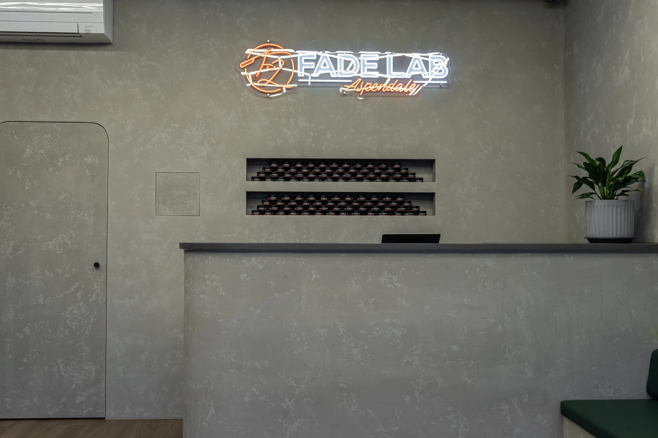 Fade Lab Barbershop in Aspendale features striking charcoal-grey Venetian plaster with a skip-trowel finish, creating depth and character. Paired with refined exterior cladding and cohesive interior Venetian plaster, these bold yet elegant finishes elevate the space, ensuring the barbershop stands out with confident modern sophistication.